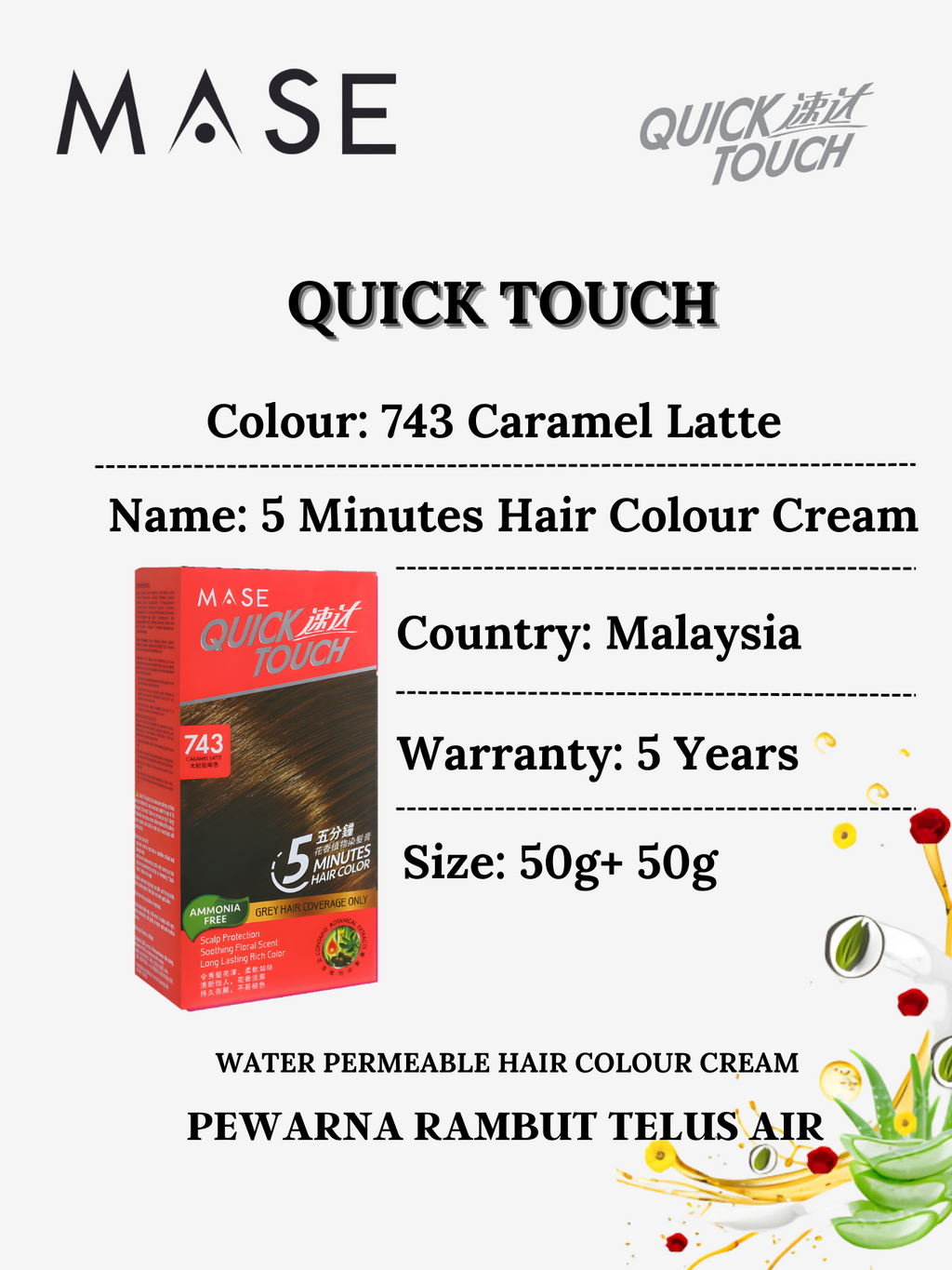 Specifications of QUICK TOUCH 5 MINUTE HAIR COLOR-743 Caramel Latte for permanent hair dye color 2020